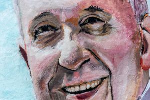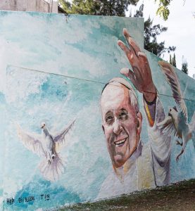 Allí en el mural luce la imborrable y majestuosa figura del Sumo Pontífice. La imagen también está acompañada de dos palomas blancas y un cielo con los colores de nuestro pabellón nacional.