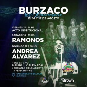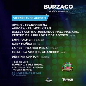 El municipio de Almirante Brown informó que este viernes 15, sábado 16 y domingo 17 de agosto celebrará un nuevo aniversario de Burzaco con shows en vivo y las mejoras propuestas del festival familiar “Brown a Cielo Abierto”, además del tradicional acto institucional.