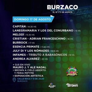 Para el domingo 17 está prevista la actuación de Capitán, Lanegramaria y los del Conurbano, Melodí, Cristian-Adrián Franceschino, Burrock, Esencia Primate, July Di y Los Nómades, Infames- Tributo a Babasónicos, y la gran baterista argentina, vecina de Burzaco, Andrea Álvarez.