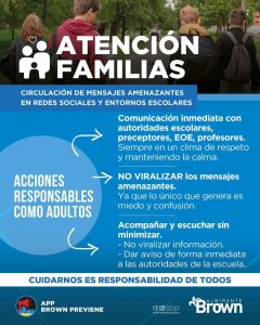 📞 Ante cualquier situación sospechosa, denunciar al 911 o a través de la App Brown Previene.