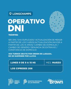 El municipio de Almirante Brown informó que desde este lunes 9 al viernes 13 de marzo, llevará adelante en articulación con el Gobierno de la provincia de Buenos Aires, un nuevo operativo de documentación en las localidades de Rafael Calzada, Longchamps, San Francisco de Asís, San Francisco Solano y Glew.