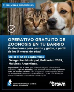 El municipio de Almirante Brown informó que del lunes 8 al viernes 12 de septiembre se llevará adelante un nuevo operativo itinerante de castración gratuita para perros y gatos, en la delegación de Malvinas Argentinas ubicada en Policastro 2389.